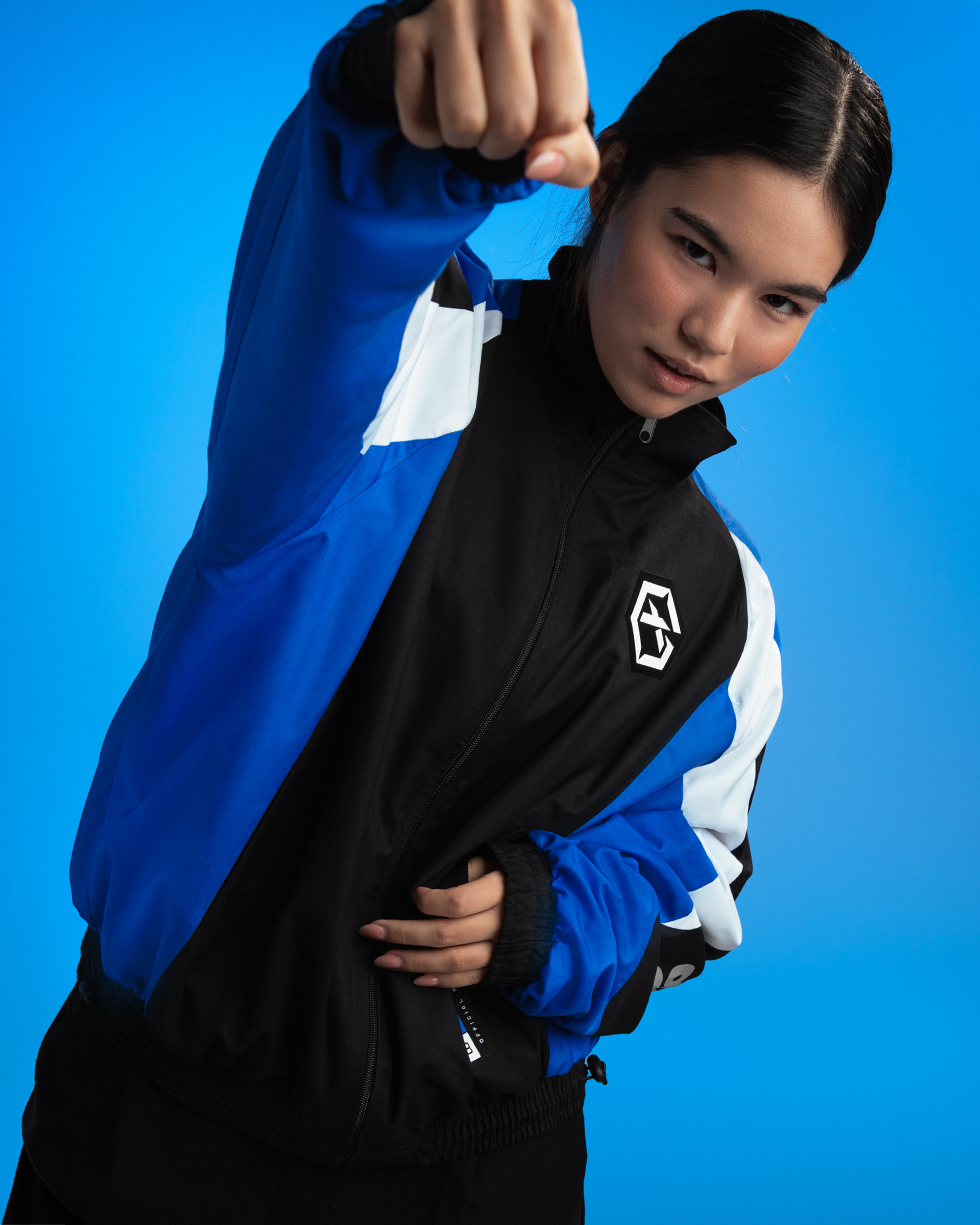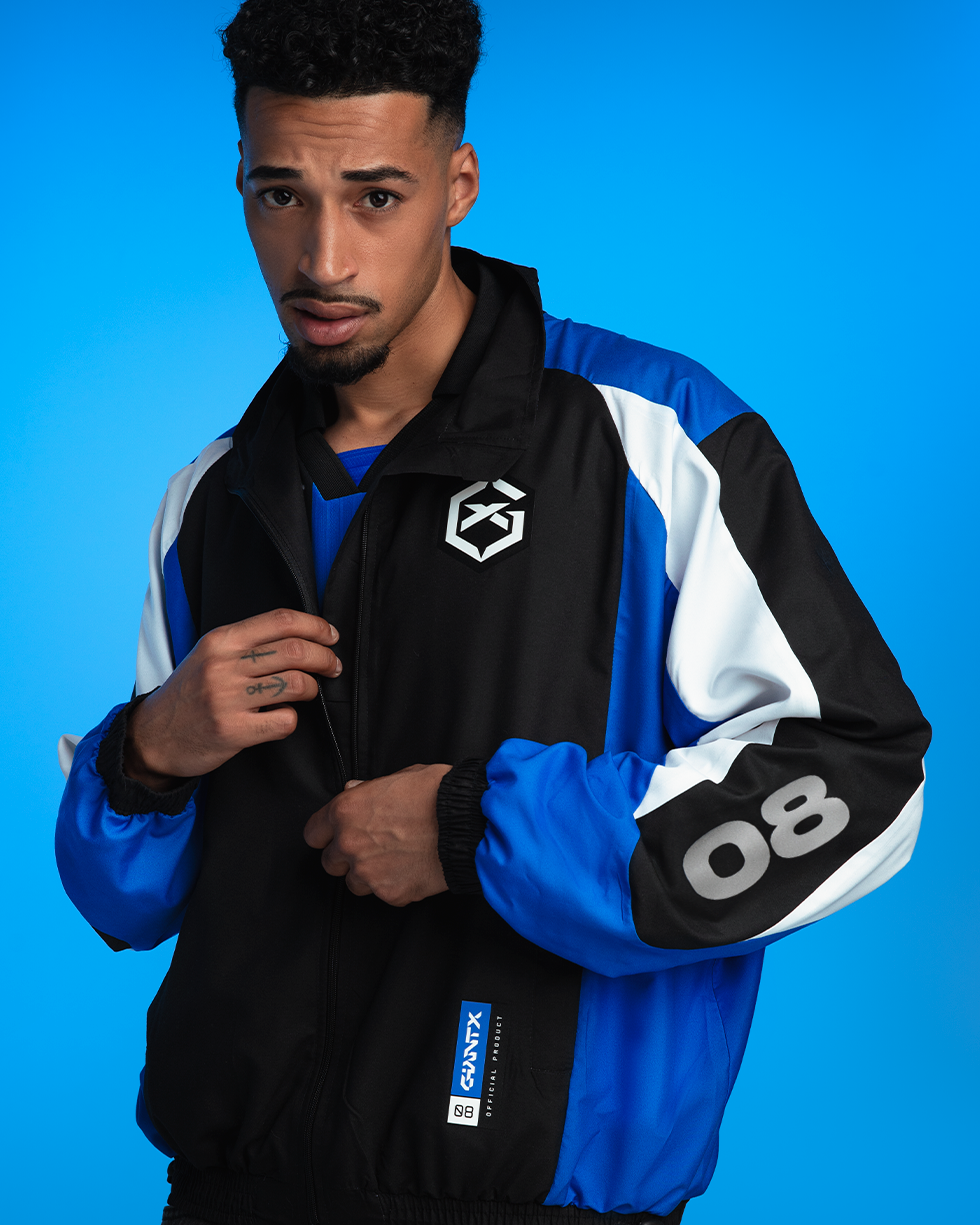 Diseñado con un contraste de colores negro, azul eléctrico y blanco, este cortavientos no solo te protege del viento y la humedad, sino que también muestra tu apoyo a GIANTX con un estilo retro boxy.